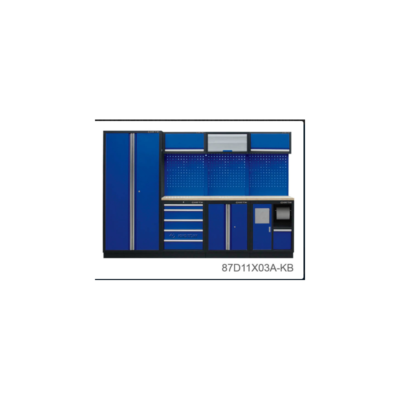 Zestaw mebli warsztatowych o wymiarach 2955 mm (dł.) x 460 mm (gł.) x 2000 mm (wys.).