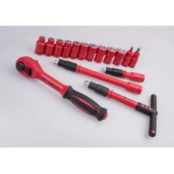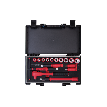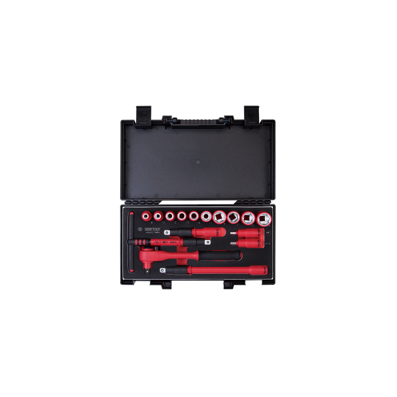 W zestawie:- nasadki w rozmiarach: 8, 10, 12, 13, 14, 17, 19, 21, 22, 24 mm,- nasadki z końcówką HEX w rozmiarach: H8, H10, - przedłużki w rozmiarach: 5 i 10, dł. 125 i 250 mm,- grzechotka, dł. 250 mm,- uchwyt typu T do nasadek, dł. 200 mm. Wymiary walizki: 389 x 230 x 66 mm. Narzędzie zgodne z normą IEC 60900:2004